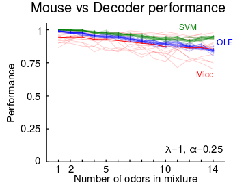 Performance of Optimal Linear (OLE), Support Vector Machine (SVM) decoder and mice in cocktail party task plotted against the number of odors in mixture stimuli. Mouse performance is from our